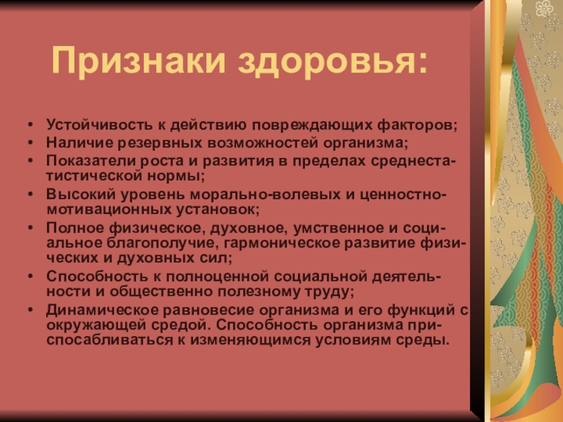 психическое и социальное благопо-лучие, а не только отсутствие бо-лезней или физических дефектов (ВОЗ (1948г.)).