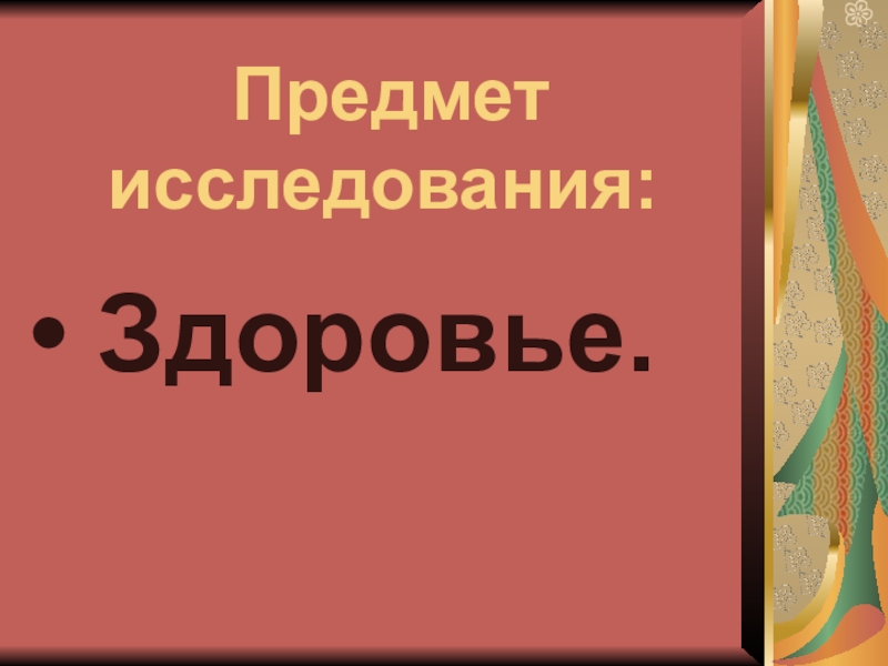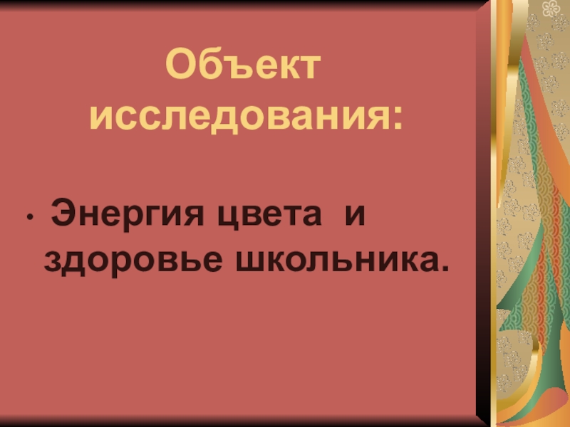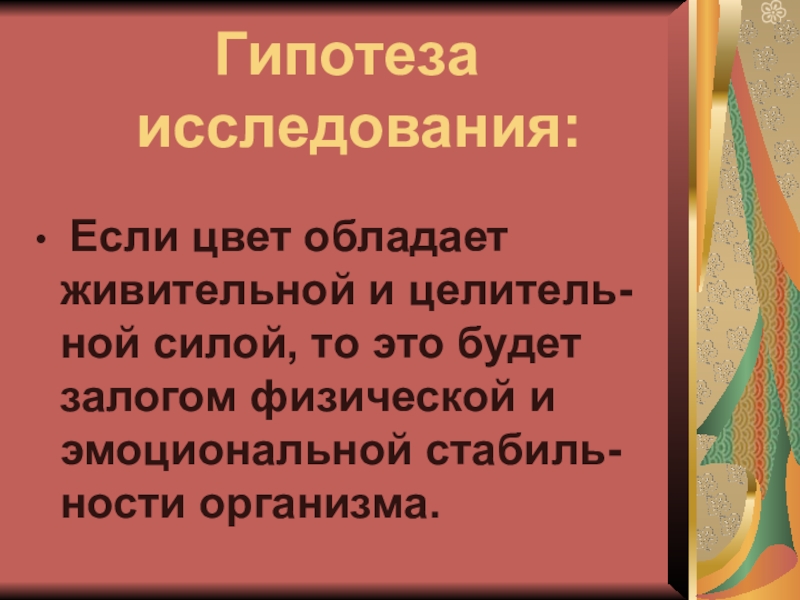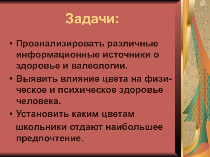 Выявить влияние цвета на физи-ческое и психическое здоровье человека.