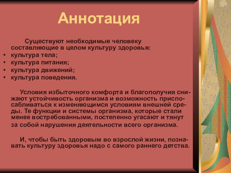 Условия избыточного комфорта и благополучия сни-жают устойчивость организма и возможность приспо-сабливаться к изменяющимся условиям внешней сре-ды. Те функции и системы организма, которые стали менее востребованными, постепенно угасают и тянут