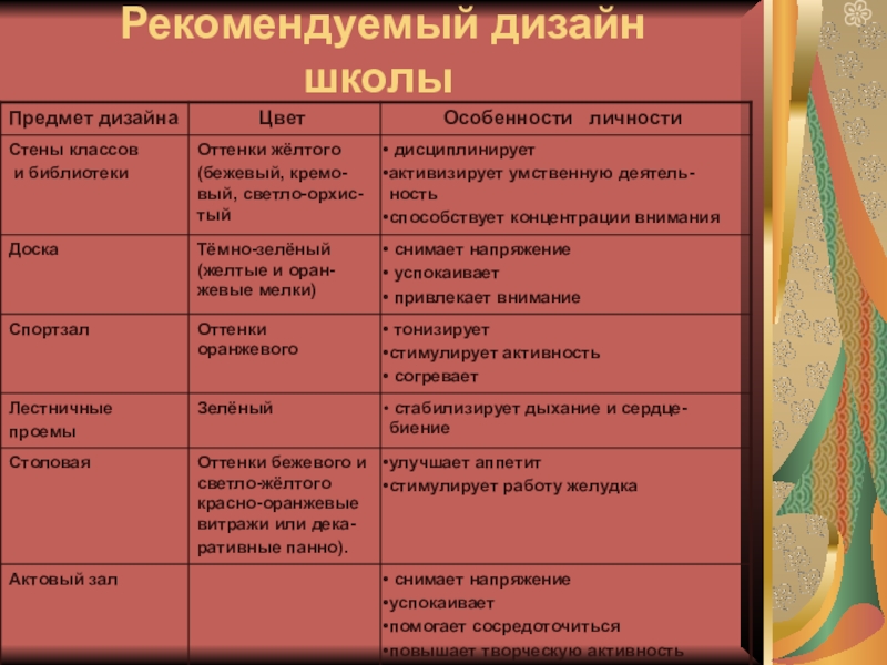 в актовом зале: использовать чередование светло-зелёных и золотисто-жёлтых плоскостей, что успо-каивало бы и снимало напряжение, а в тоже время помогало бы сосредоточиться и повышало творчес-кую активность.