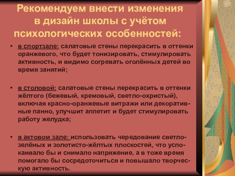 в спортзале: салатовые стены перекрасить в оттенки оранжевого, что будет тонизировать, стимулировать активность, и видимо согревать оголённых детей во время занятий;