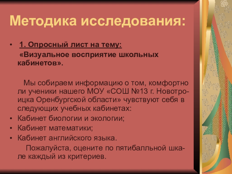 Мы собираем информацию о том, комфортно ли ученики нашего МОУ «СОШ №13 г. Новотро-ицка Оренбургской области» чувствуют себя в следующих учебных кабинетах: