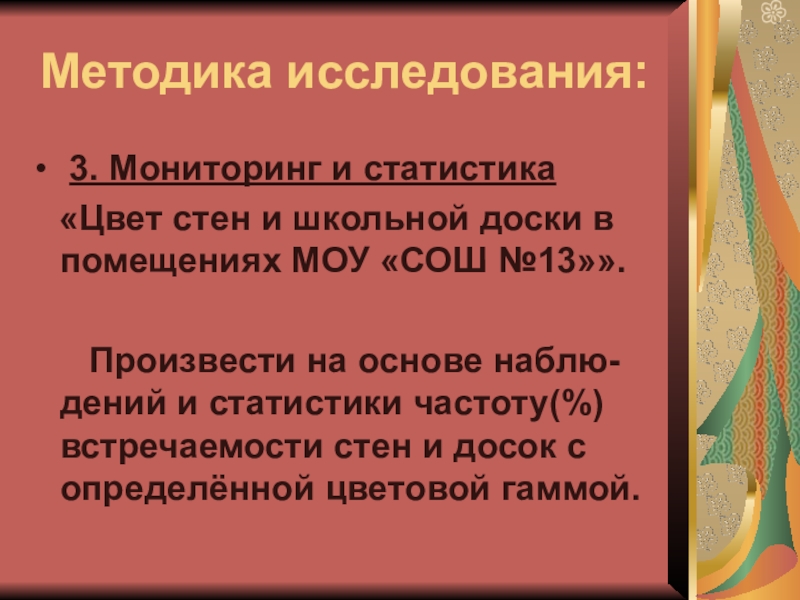 Произвести на основе наблю-дений и статистики частоту(%) встречаемости стен и досок с определённой цветовой гаммой.