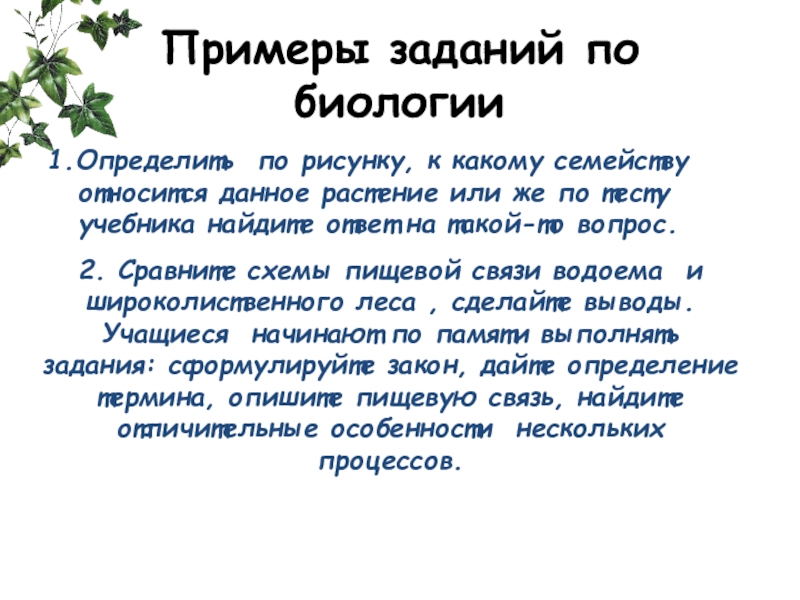 2. Сравните схемы пищевой связи водоема и широколиственного леса , сделайте выводы. Учащиеся начинают по памяти выполнять задания: сформулируйте закон, дайте определение термина, опишите пищевую связь, найдите отличительные особенности нескольких процессов.