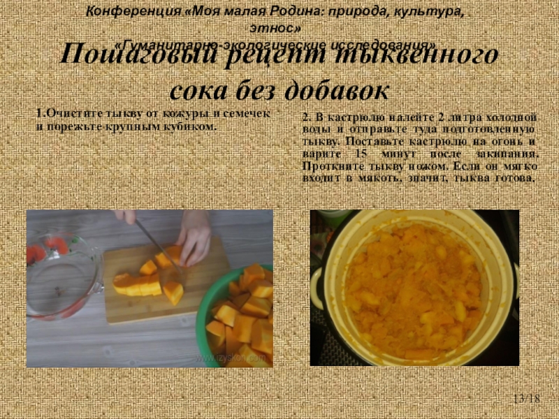 2. В кастрюлю налейте 2 литра холодной воды и отправьте туда подготовленную тыкву. Поставьте кастрюлю на огонь и варите 15 минут после закипания. Проткните тыкву ножом. Если он мягко входит в мякоть, значит, тыква готова.