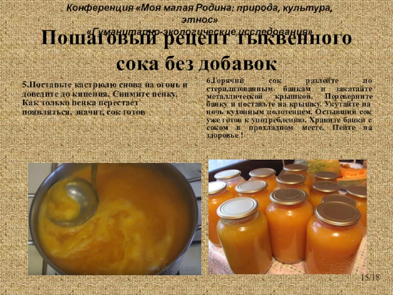 6.Горячий сок разлейте по стерилизованным банкам и закатайте металлической крышкой. Переверните банку и поставьте на крышку. Укутайте на ночь кухонным полотенцем. Остывший сок уже готов к употреблению. Храните банки с соком в прохладном месте. Пейте на здоровье !