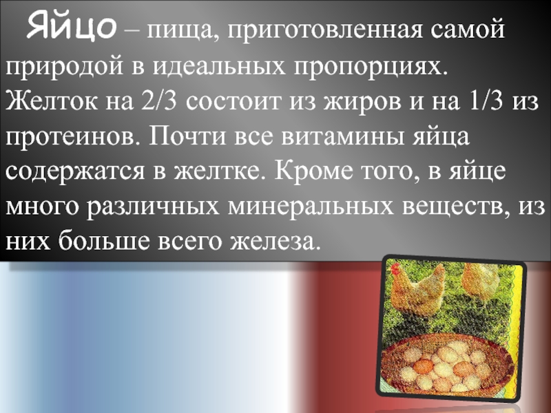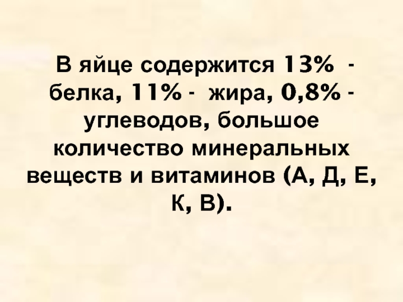 В яйце содержится 13% - белка, 11% - жира, 0,8% - углеводов, большое количество минеральных веществ и витаминов (А, Д, Е, К, В).