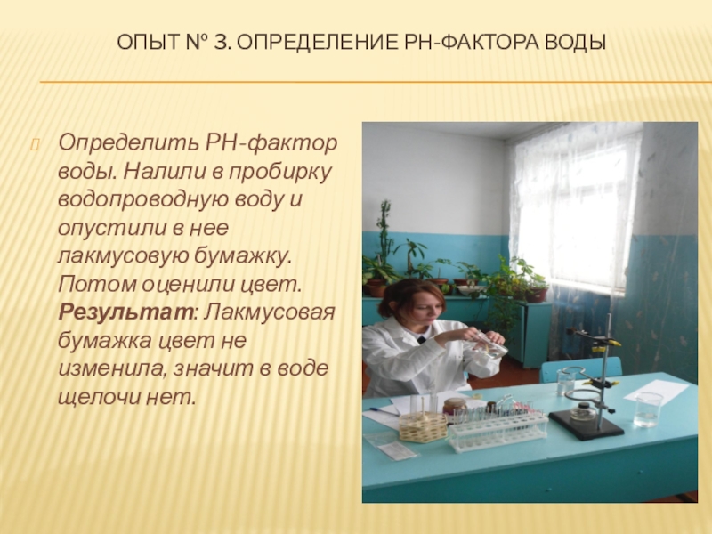 Слайд 24Опыт № 3. Определение РН-фактора воды
