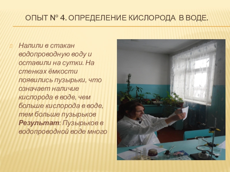 Слайд 25Опыт № 4. Определение кислорода в воде.