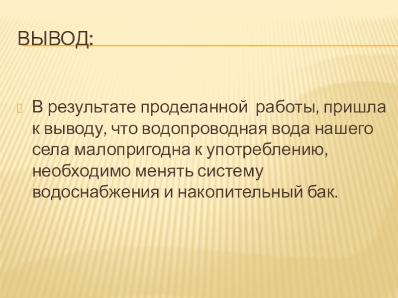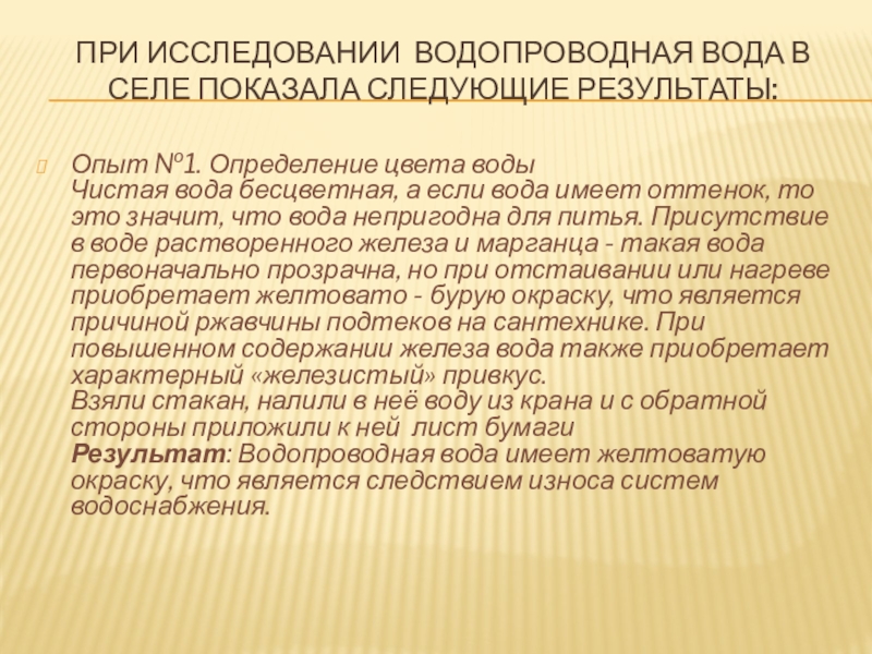 Слайд 22При исследовании водопроводная вода в селе показала следующие результаты: