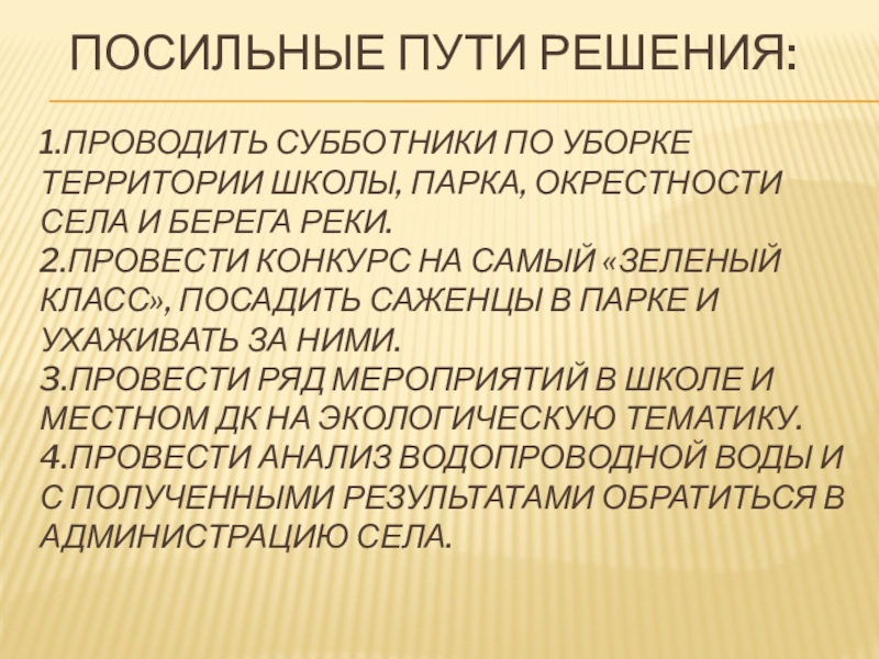 1.Проводить субботники по уборке территории школы, парка, окрестности села и берега реки.
