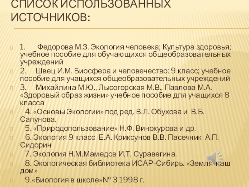 1. Федорова М.З. Экология человека; Культура здоровья; учебное пособие