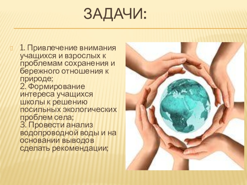 1. Привлечение внимания учащихся и взрослых к проблемам сохранения и бережного отношения к природе;