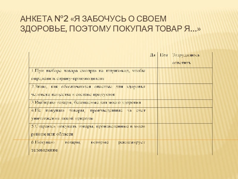 Слайд 14Анкета №2 «Я забочусь о своем здоровье, поэтому покупая товар я…»