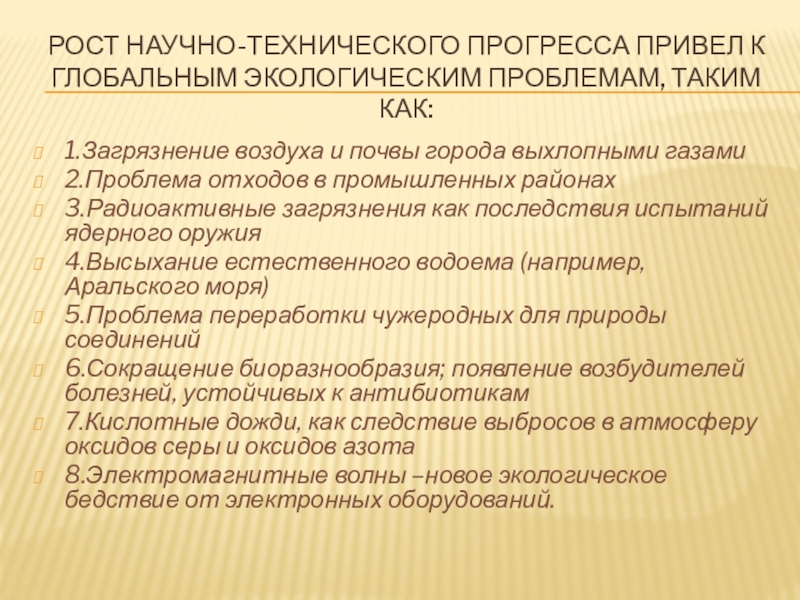 Слайд 7Рост научно-технического прогресса привел к глобальным экологическим проблемам, таким как: