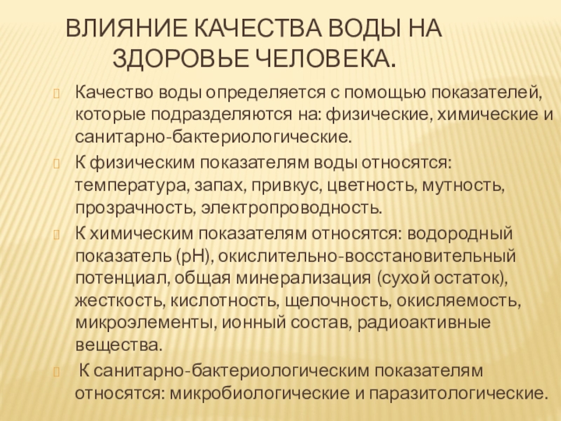 К физическим показателям воды относятся: температура, запах, привкус, цветность, мутность, прозрачность, электропроводность.