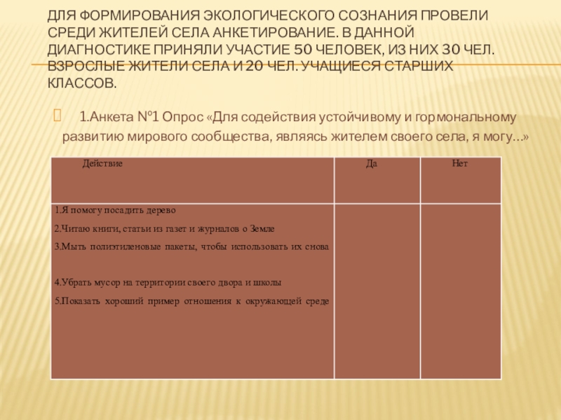 Слайд 12Для формирования экологического сознания провели среди жителей села анкетирование. В данной