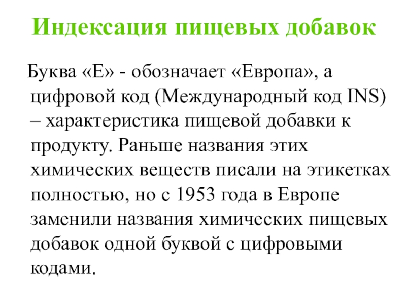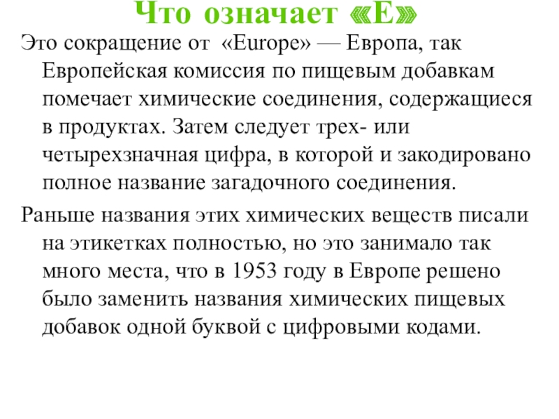 Раньше названия этих химических веществ писали на этикетках полностью, но это занимало так много места, что в 1953 году в Европе решено было заменить названия химических пищевых добавок одной буквой с цифровыми кодами.