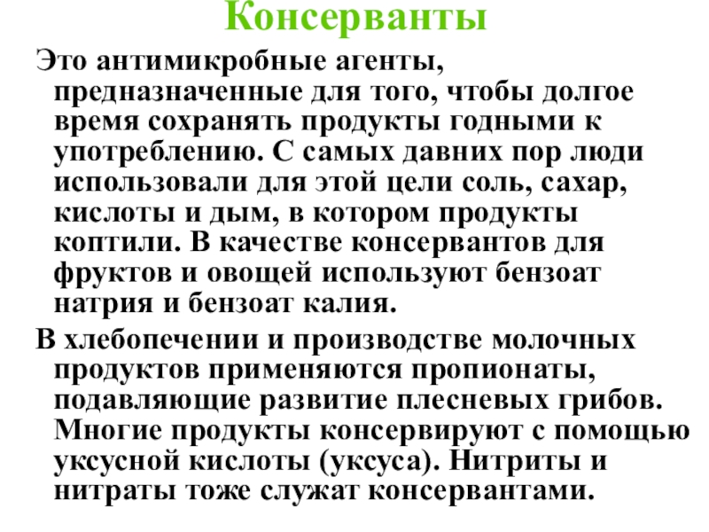 сохранять продукты годными к употреблению. С самых давних пор люди использовали для этой цели соль, сахар, кислоты и дым, в котором продукты коптили. В качестве консервантов для фруктов и овощей используют бензоат натрия и бензоат калия.