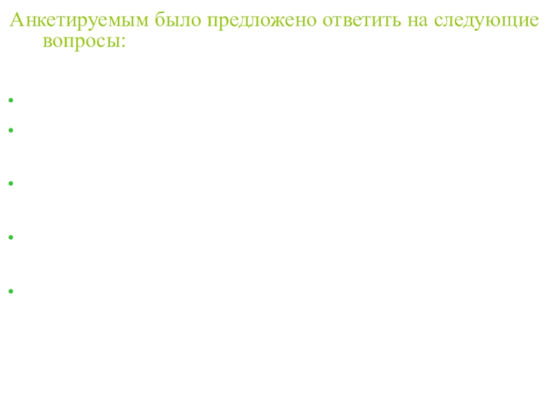 Слайд 30 Анкетируемым было предложено ответить на следующие вопросы: