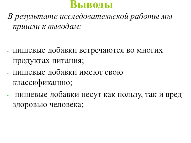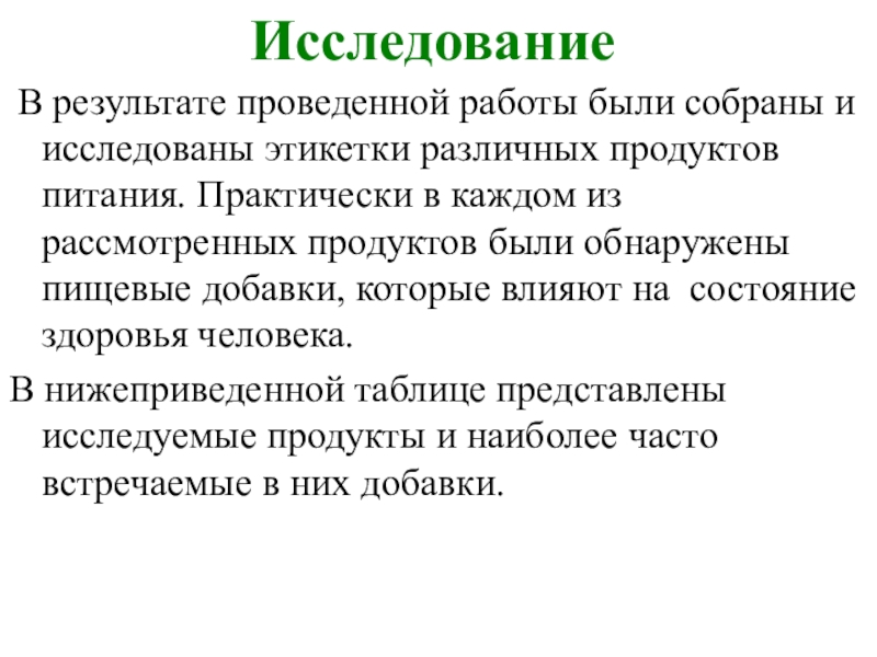 продуктов питания. Практически в каждом из рассмотренных продуктов были обнаружены пищевые добавки, которые влияют на состояние здоровья человека.