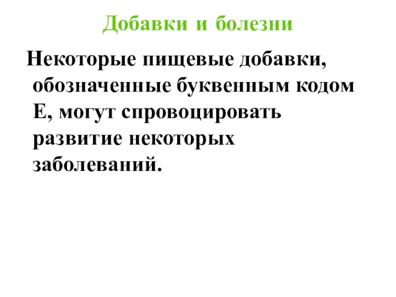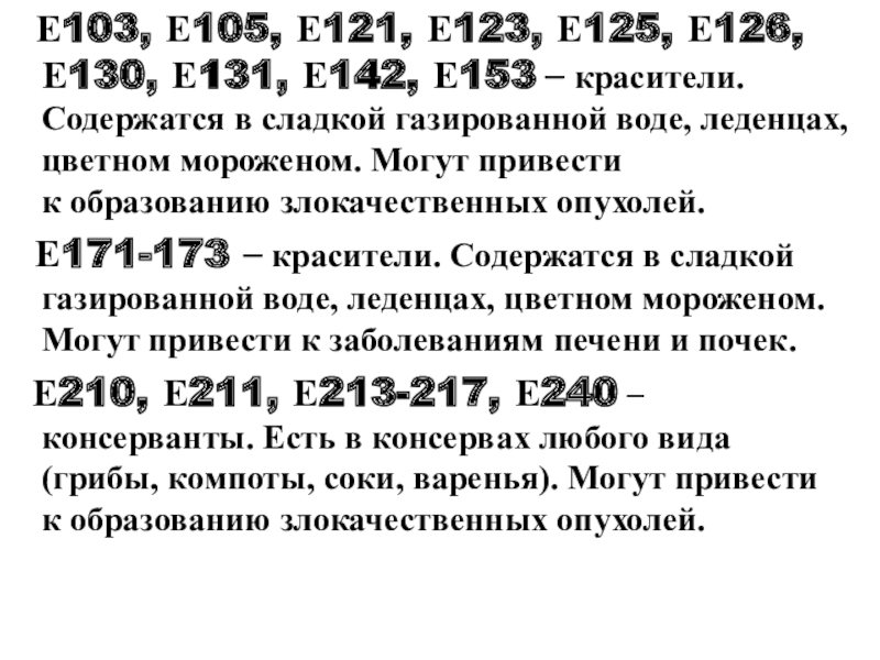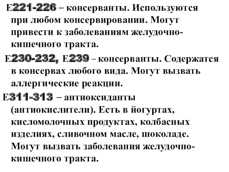 Слайд 26 Е221-226 – консерванты. Используются при любом консервировании. Могут привести к заболеваниям желудочно-кишечного тракта.