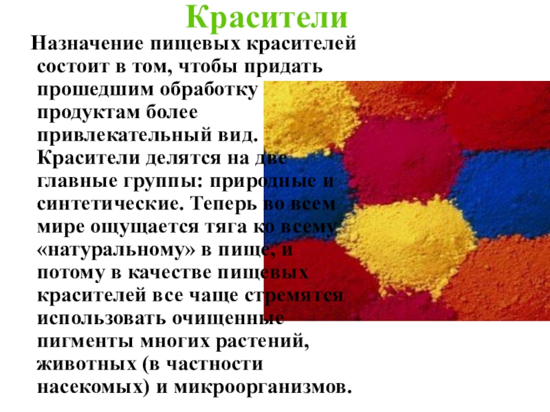 обработку продуктам более привлекательный вид. Красители делятся на две главные группы: природные и синтетические. Теперь во всем мире ощущается тяга ко всему «натуральному» в пище, и потому в качестве пищевых красителей все чаще стремятся использовать очищенные пигменты многих растений, животных (в частности насекомых) и микроорганизмов.