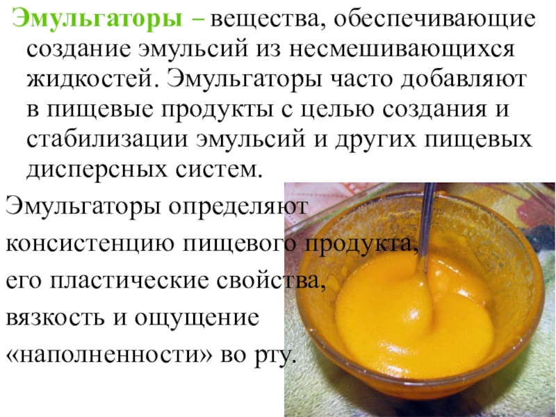 Слайд 16 Эмульгаторы – вещества, обеспечивающие создание эмульсий из несмешивающихся жидкостей. Эмульгаторы