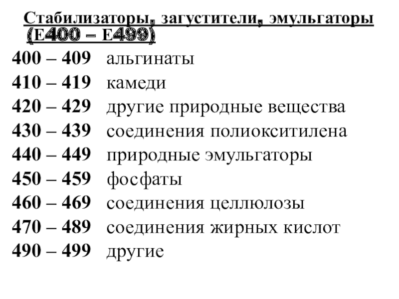 Слайд 15 Стабилизаторы, загустители, эмульгаторы (Е400 – Е499)