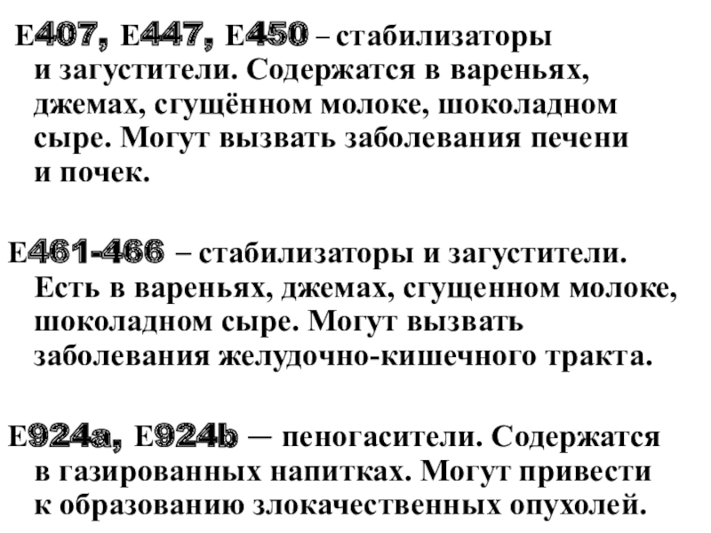 Слайд 27 Е407, Е447, Е450 – стабилизаторы и загустители. Содержатся в вареньях, джемах, сгущённом молоке,