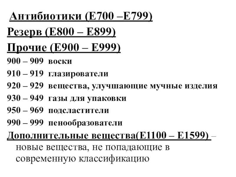 Дополнительные вещества(Е1100 – Е1599) – новые вещества, не попадающие в современную классификацию