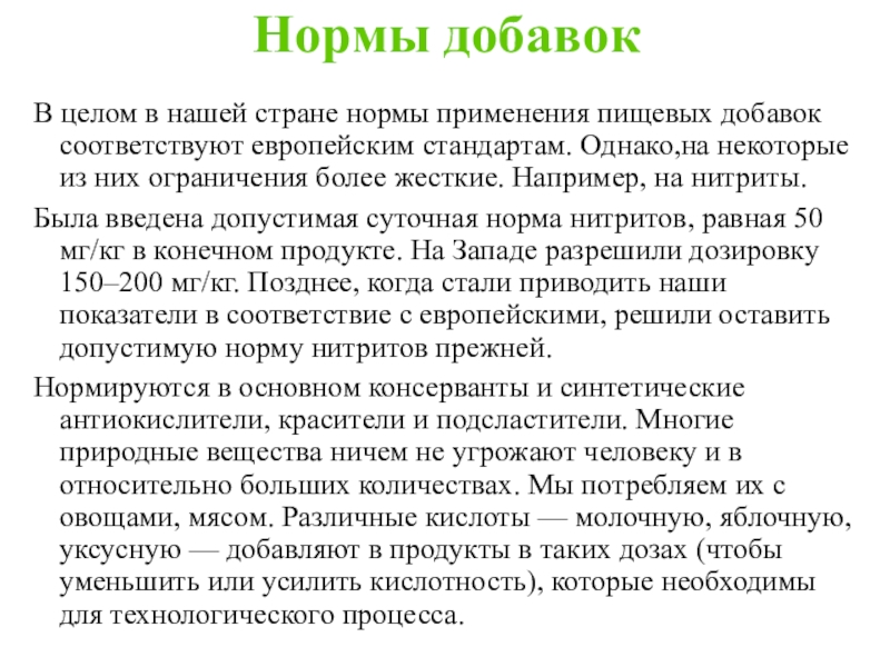 Нормируются в основном консерванты и синтетические антиокислители, красители и подсластители. Многие природные вещества ничем не угрожают человеку и в относительно больших количествах. Мы потребляем их с овощами, мясом. Различные кислоты — молочную, яблочную, уксусную — добавляют в продукты в таких дозах (чтобы уменьшить или усилить кислотность), которые необходимы для технологического процесса.
