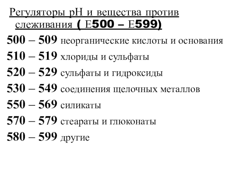 Слайд 20 Регуляторы рН и вещества против слеживания ( Е500 – Е599)