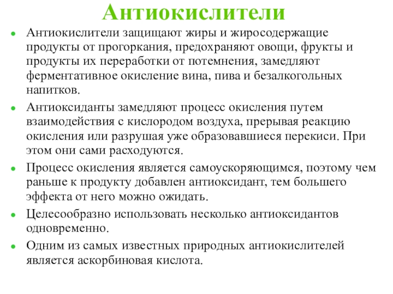 Антиокислители защищают жиры и жиросодержащие продукты от прогоркания, предохраняют овощи, фрукты