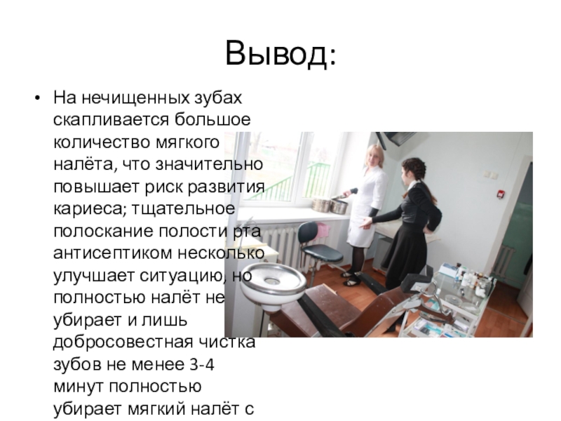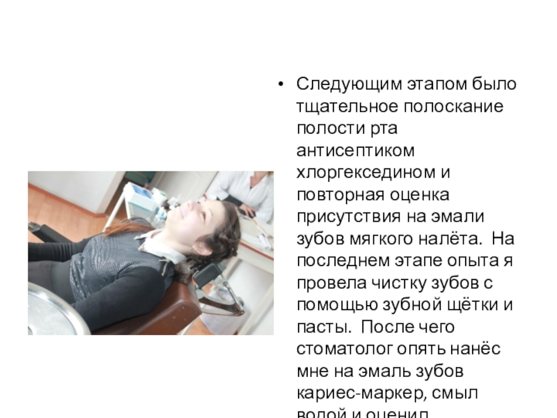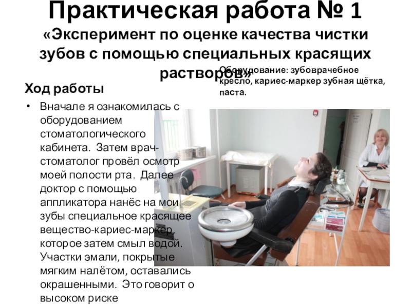 Вначале я ознакомилась с оборудованием стоматологического кабинета. Затем врач-стоматолог провёл осмотр моей полости рта. Далее доктор с помощью аппликатора нанёс на мои зубы специальное красящее вещество-кариес-маркер, которое затем смыл водой. Участки эмали, покрытые мягким налётом, оставались окрашенными. Это говорит о высоком риске возникновения кариеса.