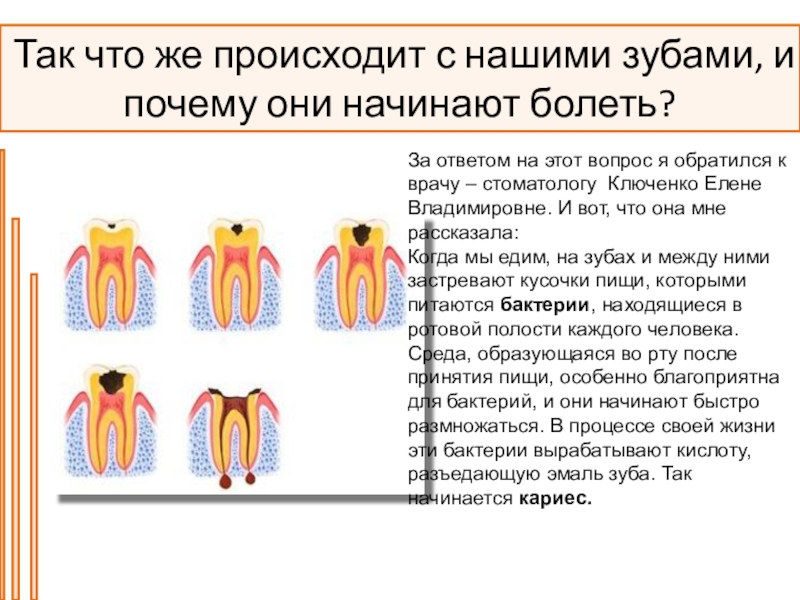 Когда мы едим, на зубах и между ними застревают кусочки пищи, которыми питаются бактерии, находящиеся в ротовой полости каждого человека. Среда, образующаяся во рту после принятия пищи, особенно благоприятна для бактерий, и они начинают быстро размножаться. В процессе своей жизни эти бактерии вырабатывают кислоту, разъедающую эмаль зуба. Так начинается кариес.