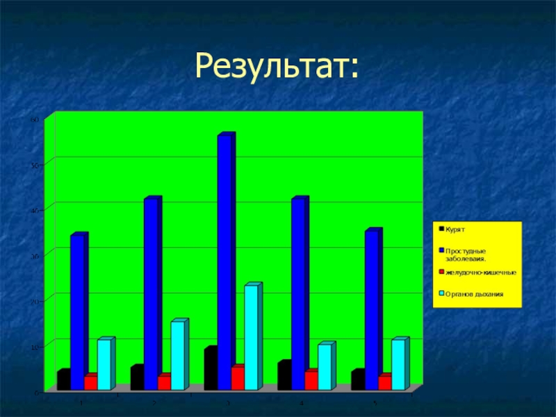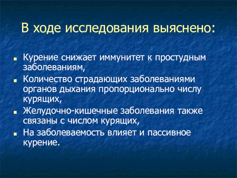В ходе исследования выяснено:Курение снижает иммунитет к простудным заболеваниям,Количество страдающих заболеваниями органов дыхания пропорционально числу курящих,Желудочно-кишечные заболевания