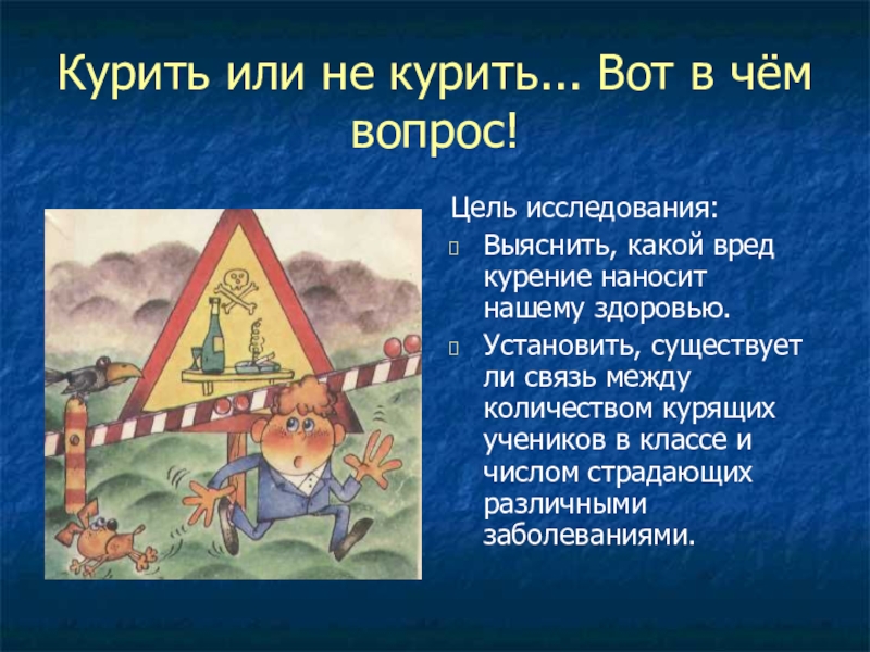 Курить или не курить... Вот в чём вопрос!Цель исследования:Выяснить, какой вред курение наносит нашему здоровью.Установить, существует ли связь между количеством курящих учеников в классе и числом страдающих различными заболеваниями.