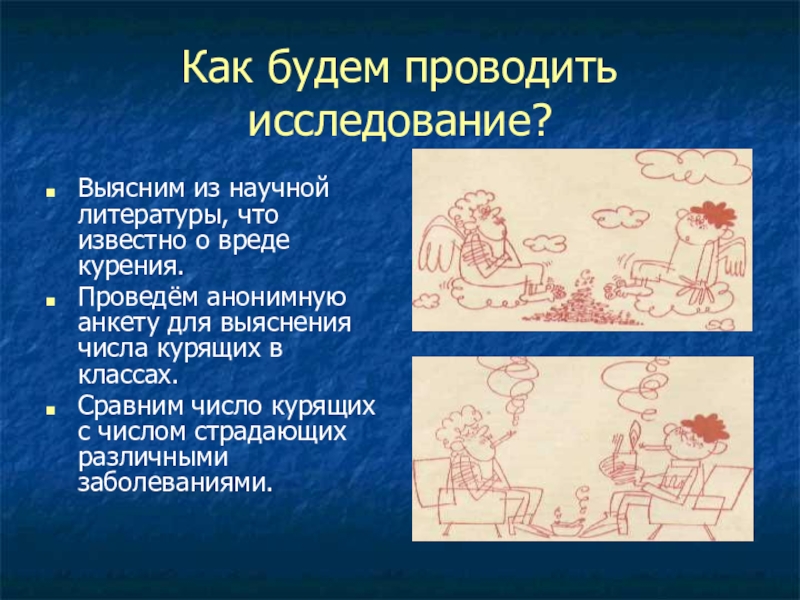 Как будем проводить исследование?Выясним из научной литературы, что известно о вреде курения.Проведём анонимную анкету для выяснения числа