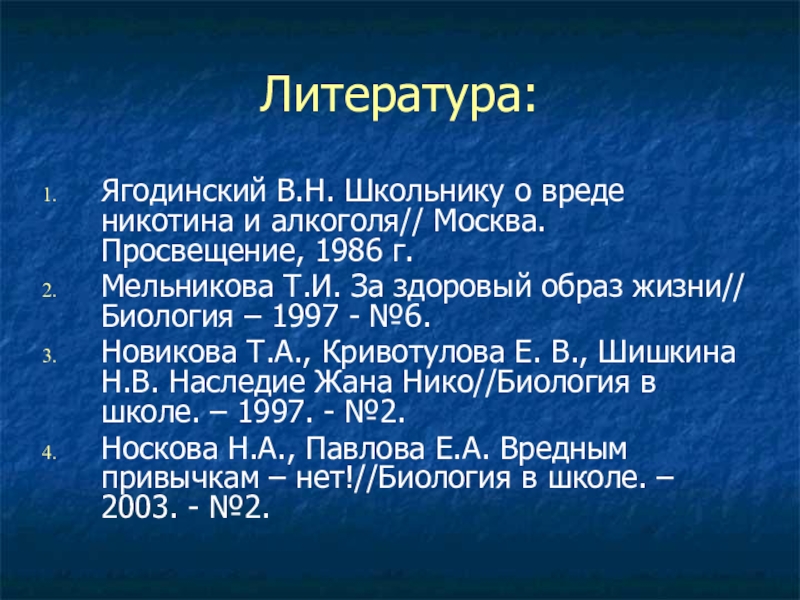 Литература:Ягодинский В.Н. Школьнику о вреде никотина и алкоголя// Москва. Просвещение, 1986 г.Мельникова Т.И. За здоровый образ жизни//