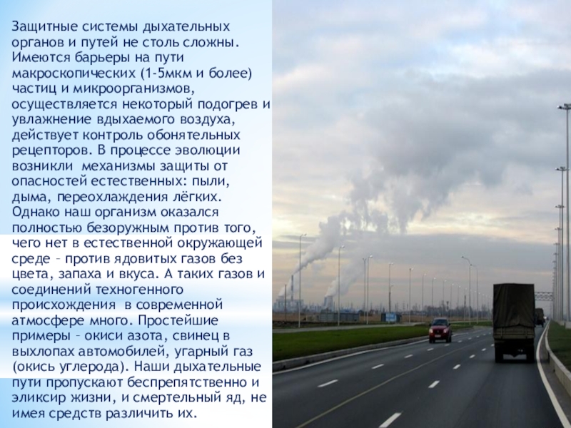 на пути макроскопических (1-5мкм и более) частиц и микроорганизмов, осуществляется некоторый подогрев и увлажнение вдыхаемого воздуха, действует контроль обонятельных рецепторов. В процессе эволюции возникли механизмы защиты от опасностей естественных: пыли, дыма, переохлаждения лёгких. Однако наш организм оказался полностью безоружным против того, чего нет в естественной окружающей среде – против ядовитых газов без цвета, запаха и вкуса. А таких газов и соединений техногенного происхождения в современной атмосфере много. Простейшие примеры – окиси азота, свинец в выхлопах автомобилей, угарный газ (окись углерода). Наши дыхательные пути пропускают беспрепятственно и эликсир жизни, и смертельный яд, не имея средств различить их.