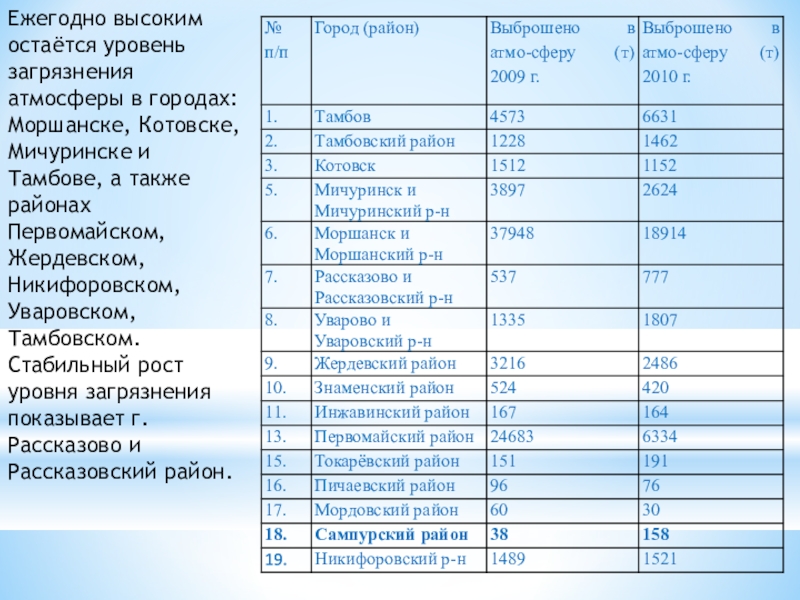 и Тамбове, а также районах Первомайском, Жердевском, Никифоровском, Уваровском, Тамбовском. Стабильный рост уровня загрязнения показывает г. Рассказово и Рассказовский район.