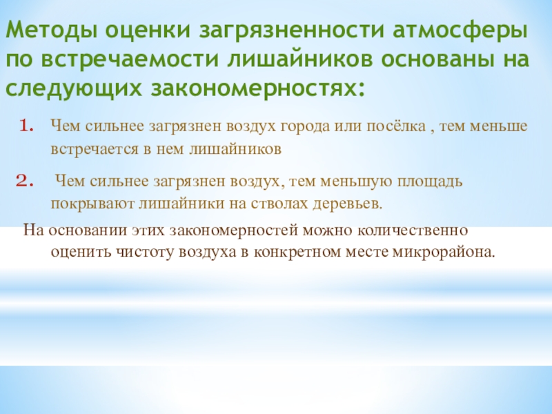 Слайд 12Методы оценки загрязненности атмосферы по встречаемости лишайников основаны на следующих закономерностях: