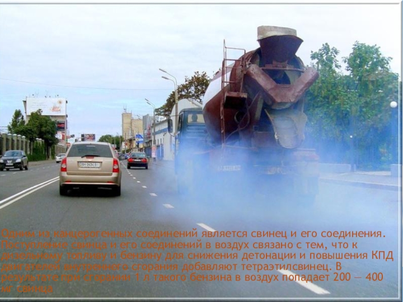 и его соединений в воздух связано с тем, что к дизельному топливу и бензину для снижения детонации и повышения КПД двигателей внутреннего сгорания добавляют тетраэтилсвинец. В результате при сгорании 1 л такого бензина в воздух попадает 200 — 400 мг свинца