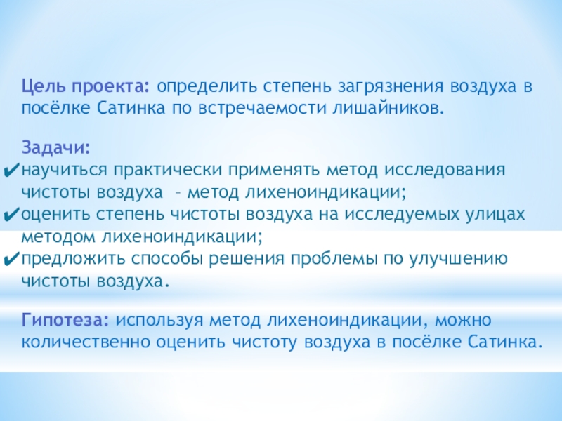 Гипотеза: используя метод лихеноиндикации, можно количественно оценить чистоту воздуха в посёлке Сатинка.