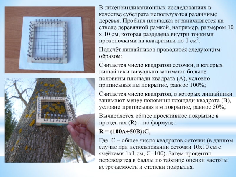 Считается число квадратов сеточки, в которых лишайники визуально занимают больше половины площади квадрата (А), условно приписывая им покрытие, равное 100%;