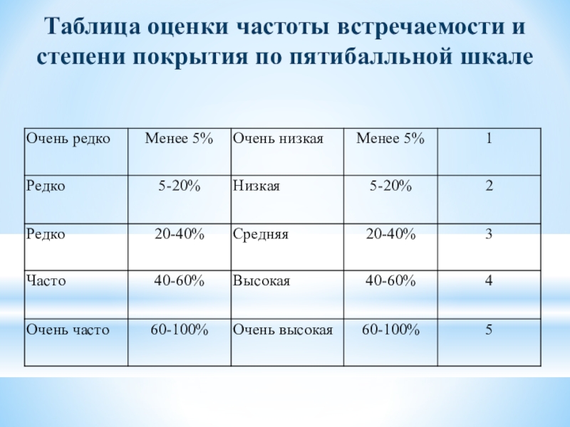 Слайд 14Таблица оценки частоты встречаемости и степени покрытия по пятибалльной шкале