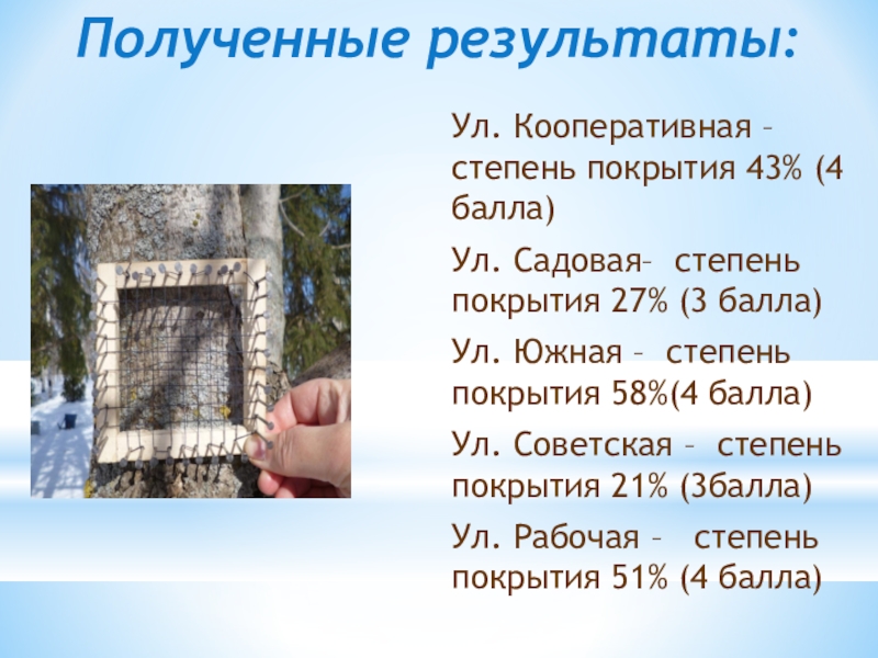 Для проведения исследования были выбраны две центральные улицы – Советская и Кооперативная, а также по одной улице из каждой части. Это улицы Садовая, Рабочая и Южная. В качестве субстрата были выбраны рябина обыкновенная, каштан и клён как самые распространённые деревья. Для оценки загрязнения атмосферы конкретной улицы подсчитывали лишайники, которые растут на деревьях по обеим сторонам улицы на каждом пятом дереве.