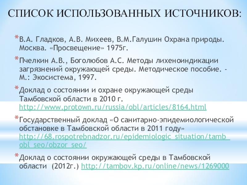 Доклад о состоянии и охране окружающей среды Тамбовской области в 2010 г. http://www.protown.ru/russia/obl/articles/8164.html