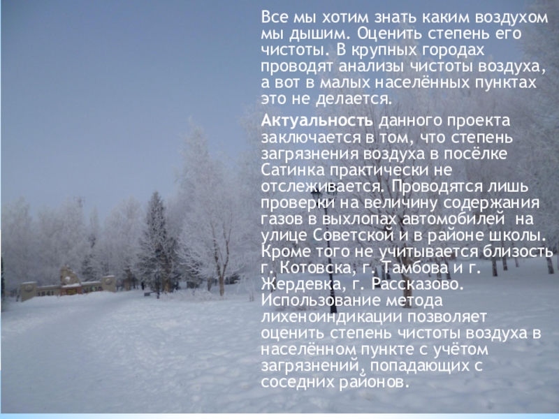 Актуальность данного проекта заключается в том, что степень загрязнения воздуха в посёлке Сатинка практически не отслеживается. Проводятся лишь проверки на величину содержания газов в выхлопах автомобилей на улице Советской и в районе школы. Кроме того не учитывается близость г. Котовска, г. Тамбова и г. Жердевка, г. Рассказово. Использование метода лихеноиндикации позволяет оценить степень чистоты воздуха в населённом пункте с учётом загрязнений, попадающих с соседних районов.